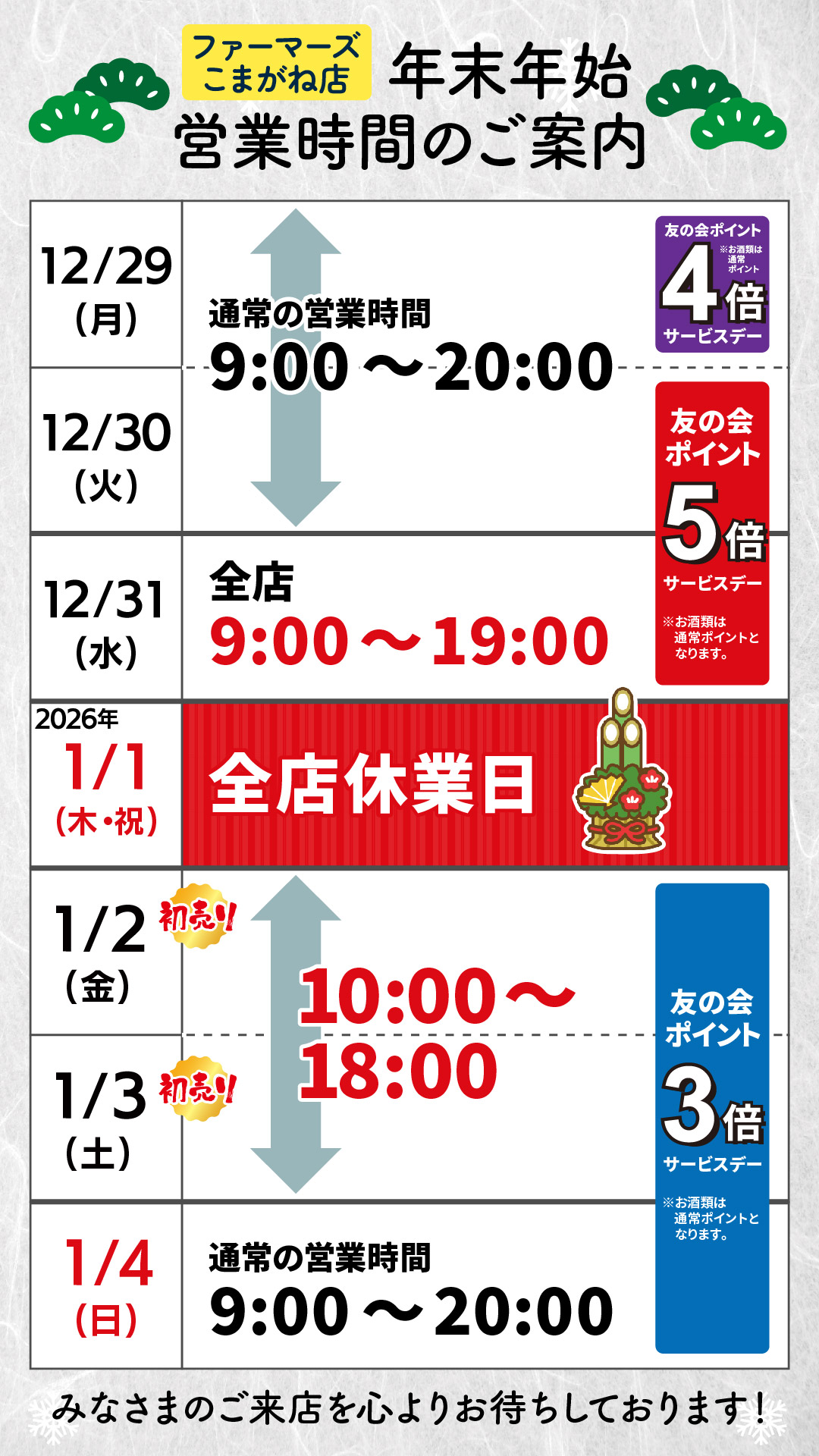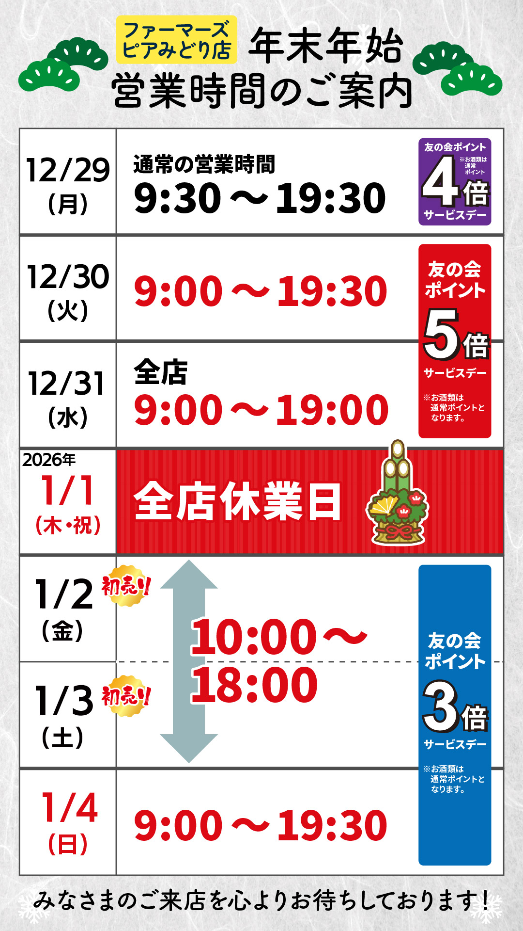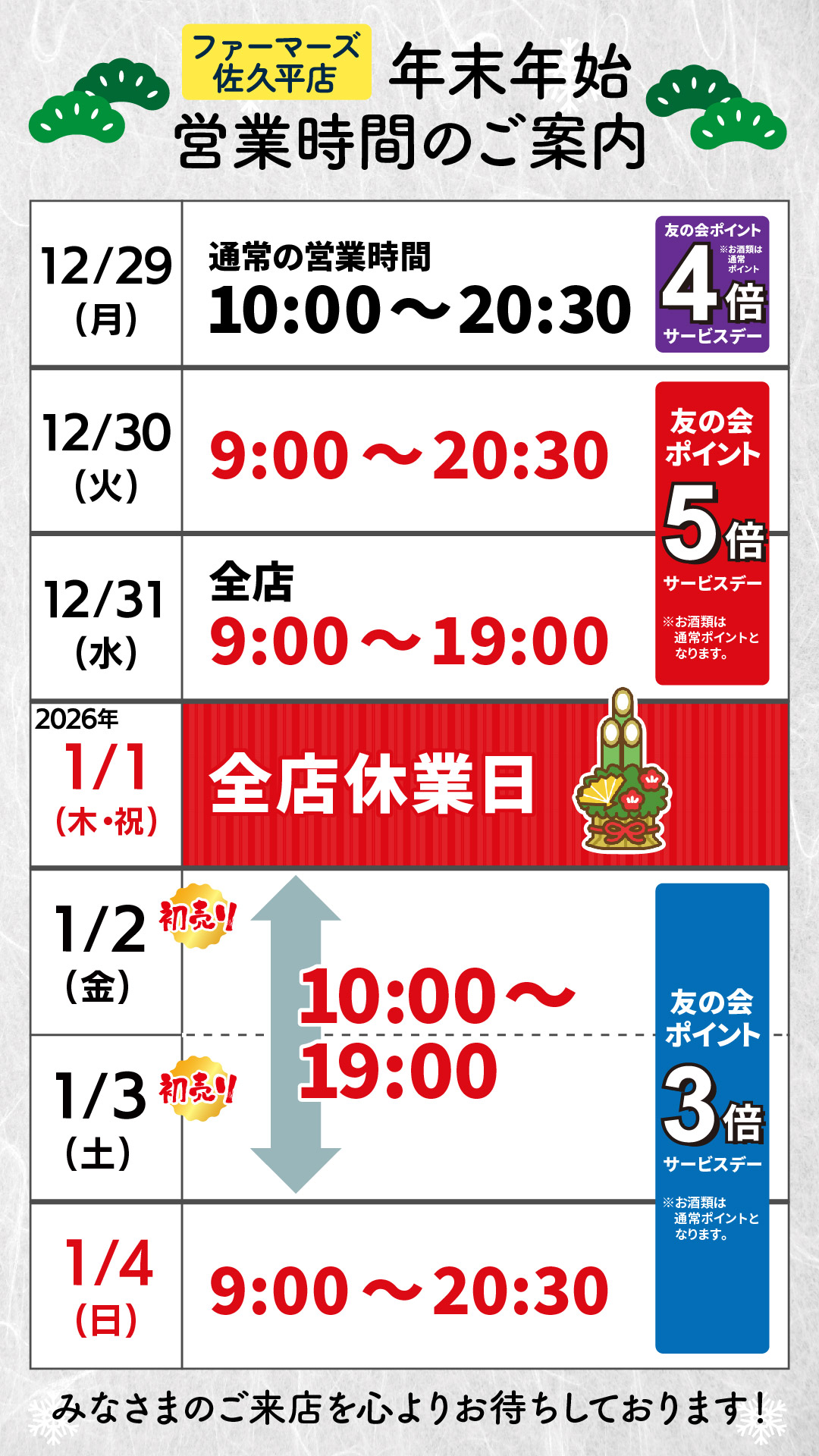 また、2026年1月1日(元日)は全店休業となります。