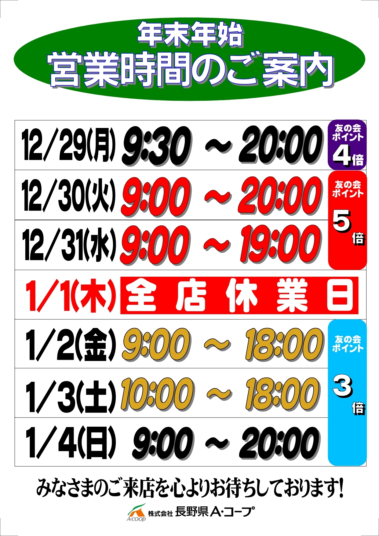 本年も長野県A・コープをご愛顧いただき誠にありがとうございました。