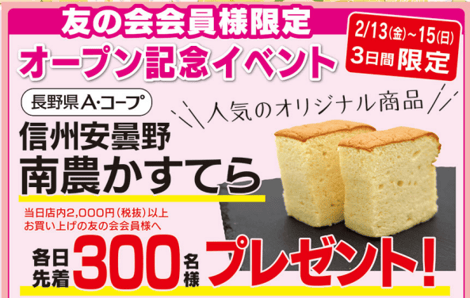 当日2,000円(税抜)以上お買い物🛒🛒いただいた友の会会員様 各日先着300名様に、長野県A・コープオリジナル「南農かすてら」をプレゼント!🎁✨